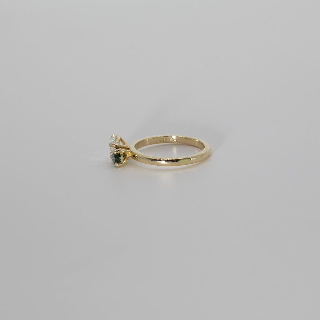 A one of a kind 14ct yellow gold ring with a pear cut diamond and sapphire set in the centre.