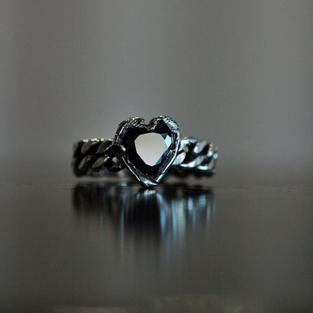 The Lover Ring in 925 sterling silver. Curb chain band with a 6mm heart shaped Onyx