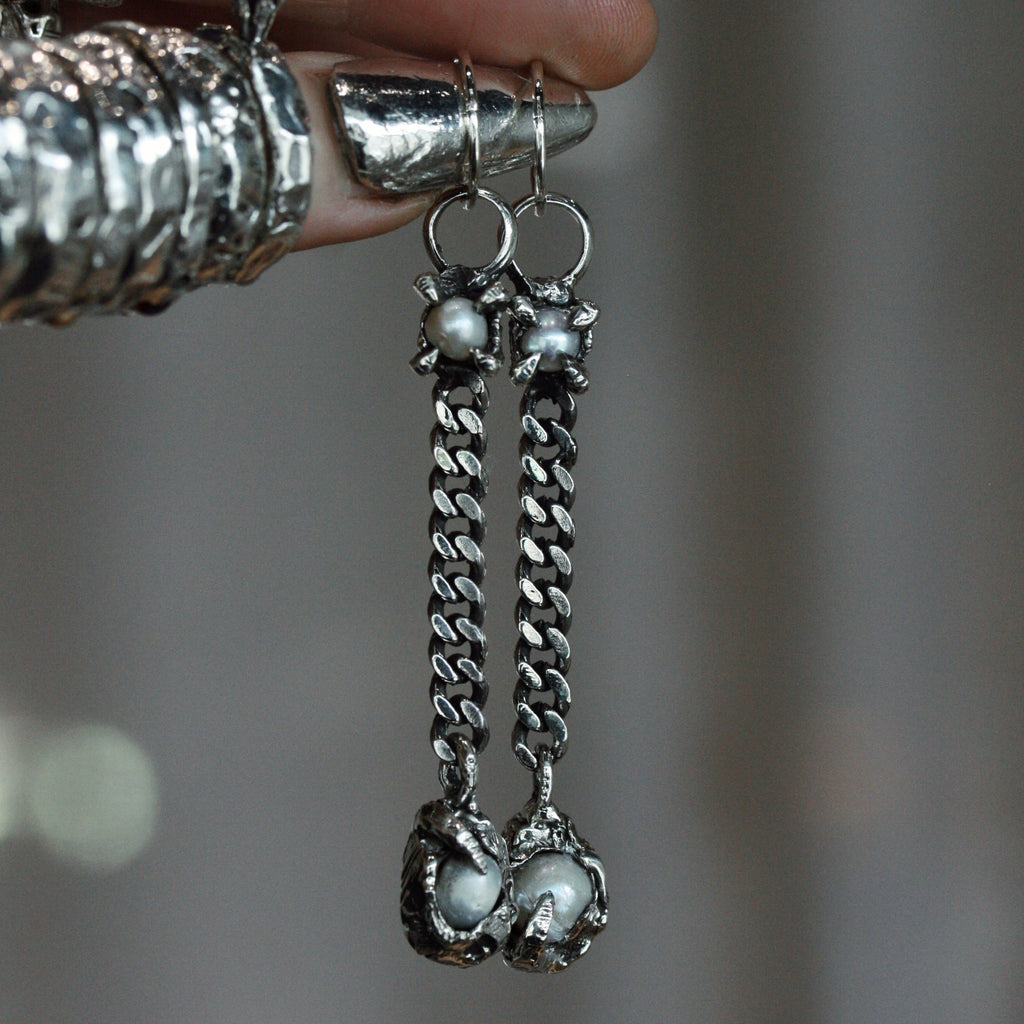 A pair of kinetic silver pendant earrings. Featuring cast curb chain elements, four freshwater pearls, suspended from 12mm endless hoops.