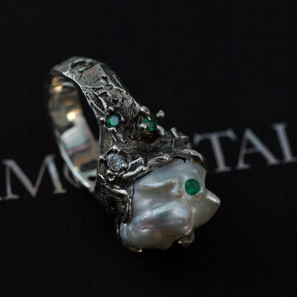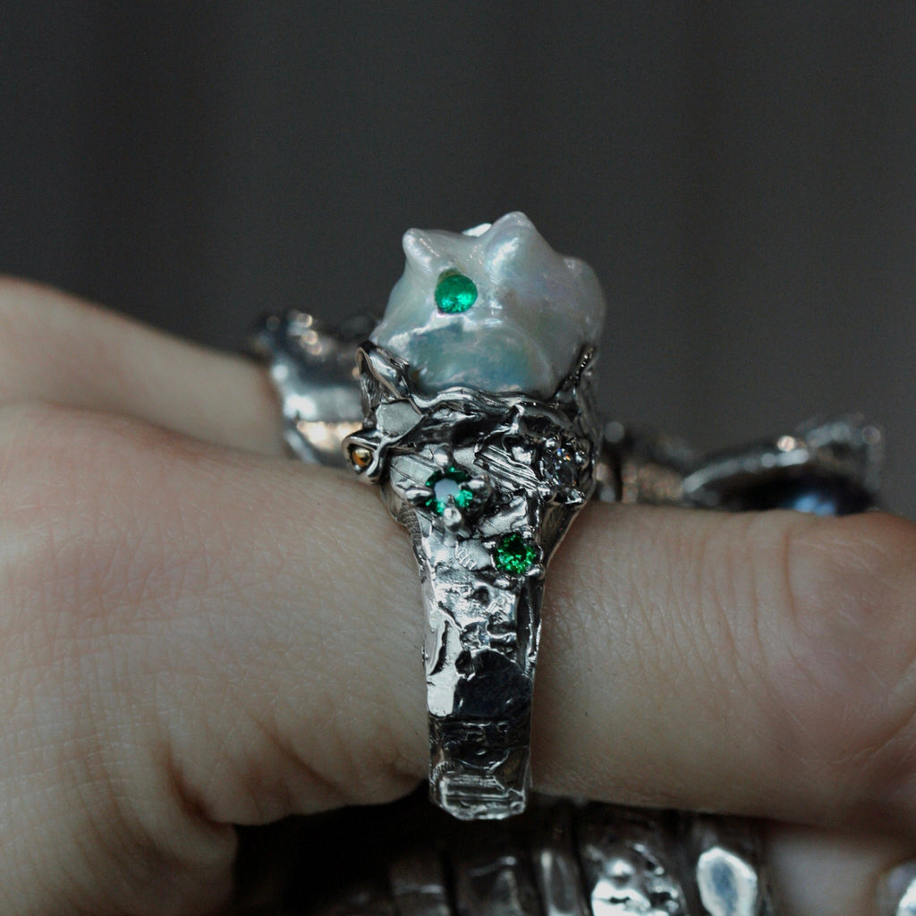 An otherworldly baroque pearl emerges from a sculptural molten silver band, studded with emeralds, white sapphires and gold granules.