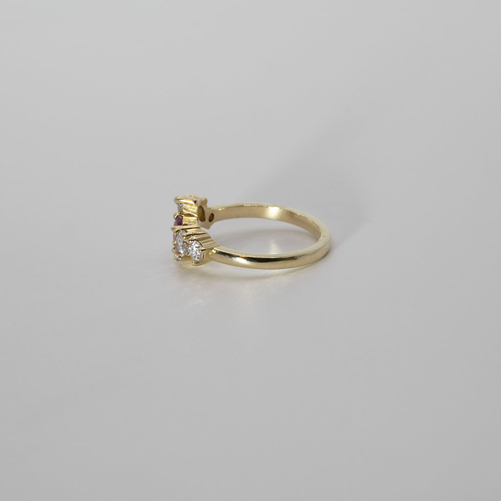 A stunning one of a kind 14ct yellow gold ring with a scattering of marquise, pear and round lab grown diamonds with pink sapphires claw set into 1/3 of the band.